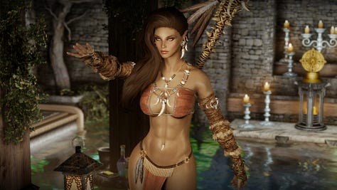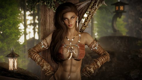 Long ago, even before The First Era, The Bosmer are commonly believed to have had constantly changing forms known as “Changelings” during the Dawn Era, and were eventually taught to maintain one shape by Y’ffre (the forest God) under the terms of the Green Pact. Therefor, it was thought that the ability to change form into an animal was lost to all Bosmer. At some point in the past, Coralyn’s parents offended the Daedric Prince of Madness, Sheogorath, and he cursed their child, Coralyn, with the ability to change shape into a wolf as a joke (something the Mad God has been known to do quite often). As this ability is taboo to all Bosmer due to the terms of the Green Pact, Coralyn’s parents left Valenwood to keep her secret safe and protect her from persecution at the hands of her own people.