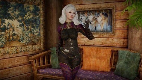 This is one of those mods that I just got a whim to make a replacer for based on a suggestion in Discord. A friend, Gonzeh, mentioned this follower who is voiced by the talented Kerstyn Unger. I decided to go look at the mod page and then I was doomed. I had to make a replacer. Ancient Elf? Check. White hair? Check (you folks know I have a weakness for white-haired girls). Kerstyn voiced her. Home run. So I was a bad bad man and diverted some of my time to make this replacer for Morgaine by GhostWarrior13000. Thanks a lot, Gonzeh. No really, I mean it - thanks. She was fun to make and I like how she came out.